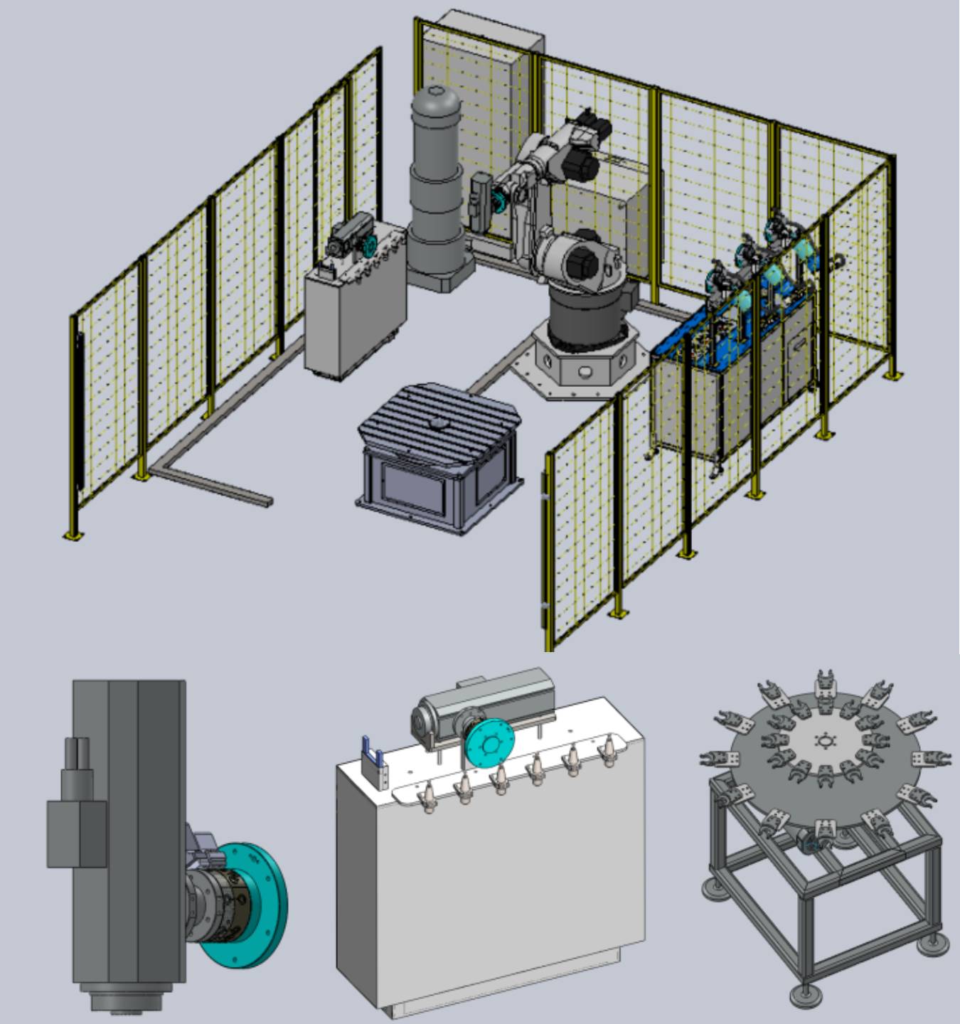 - Cells support a 6-axis robot with a rotary station, auto tool/paper change, probing/laser alignment, and dust extraction.